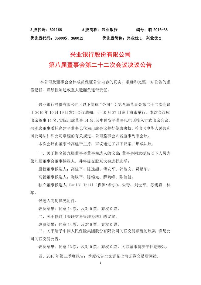 兴业银行股份有限公司第八届董事会第二十二次会议决议公告.doc