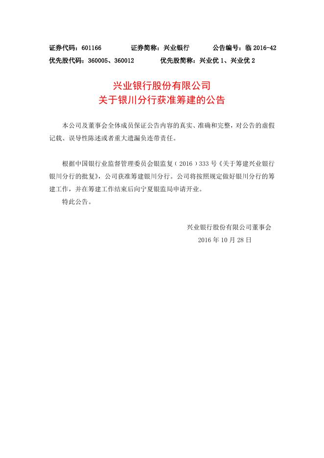 兴业银行股份有限公司关于银川分行获准筹建的公告.doc