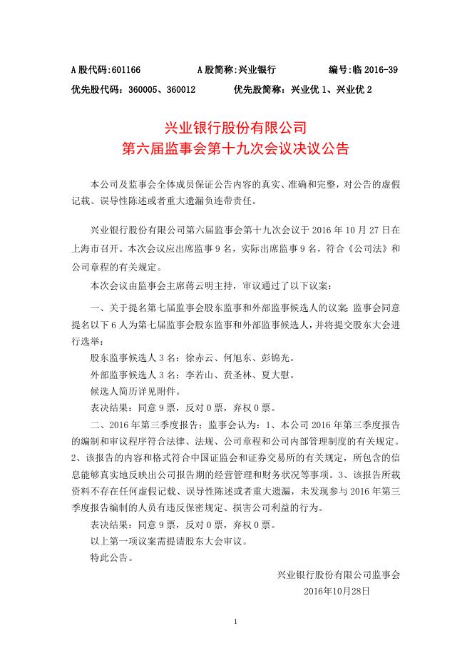 兴业银行股份有限公司第六届监事会第十九次会议决议公告.doc