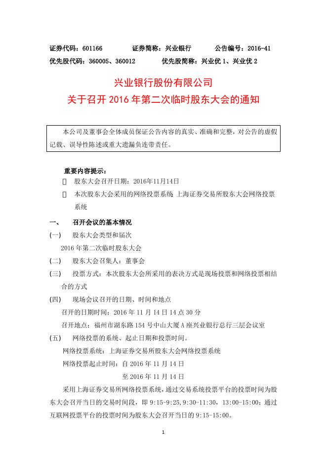 兴业银行股份有限公司关于召开2016年第二次临时股东大会的通知.docx