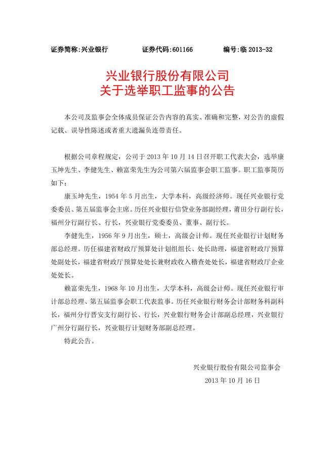 兴业银行股份有限公司 关于选举职工监事的公告.doc