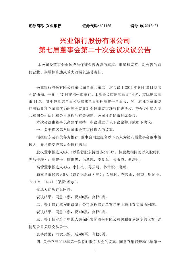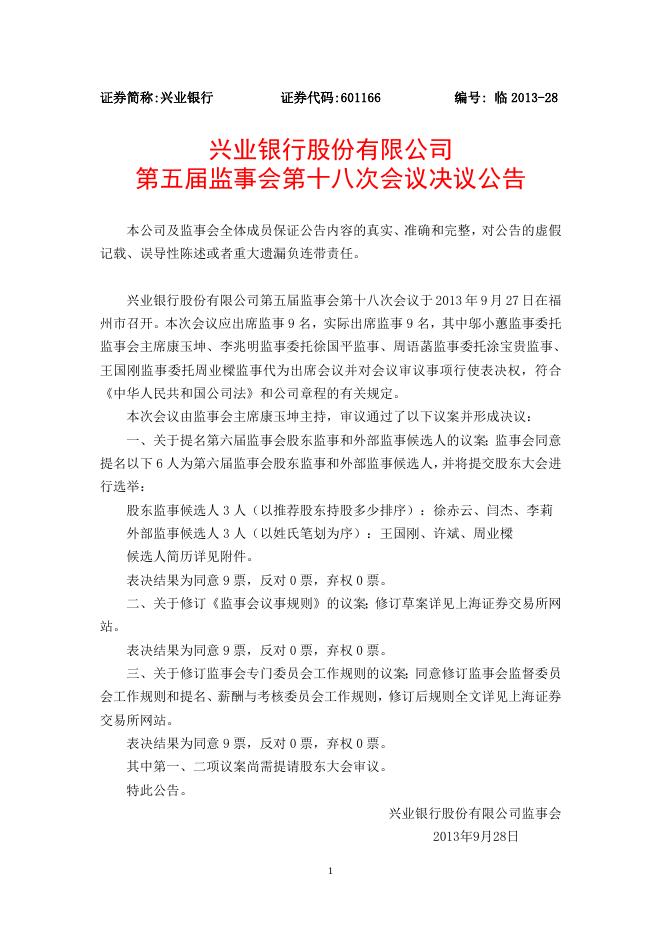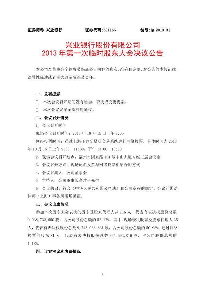 兴业银行股份有限公司 2013年第一次临时股东大会决议公告.doc