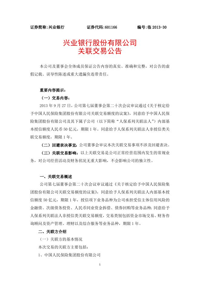 兴业银行股份有限公司关联交易公告.doc