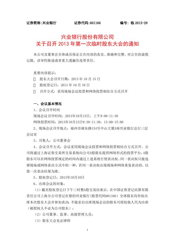 兴业银行股份有限公司关于召开2013年第一次临时股东大会的通知.doc