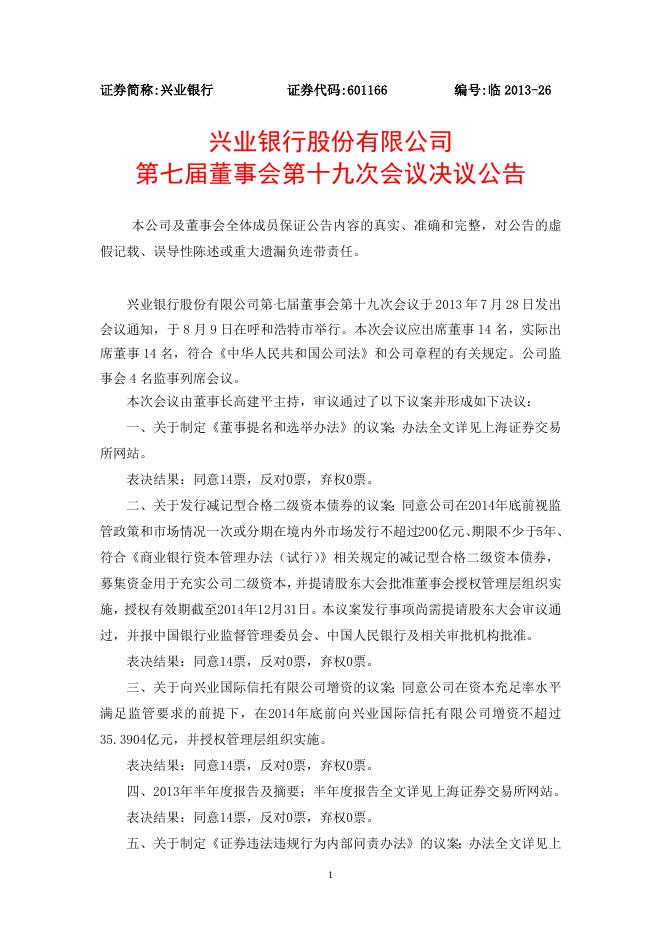 兴业银行股份有限公司第七届董事会第十九次会议决议公告.doc