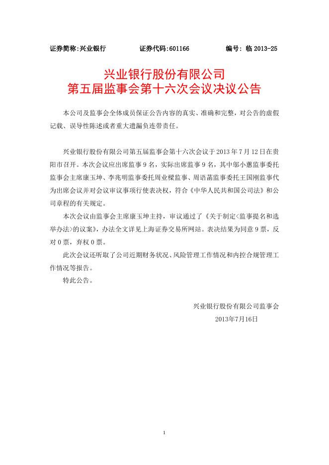 兴业银行股份有限公司第五届监事会第十六次会议决议公告.doc