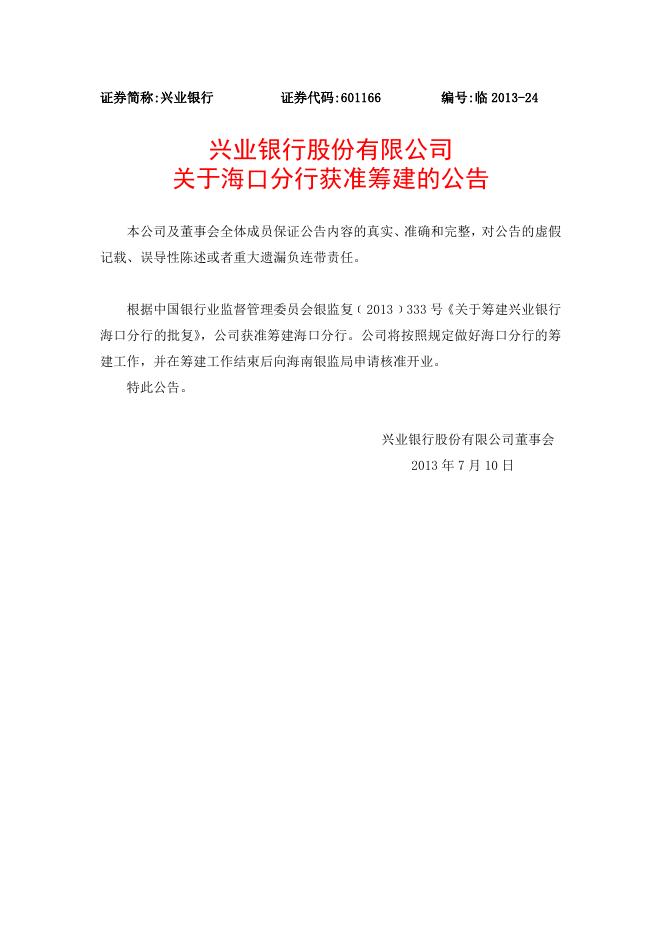 兴业银行股份有限公司关于海口分行获准筹建的公告.doc