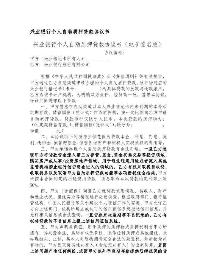 兴业银行个人自助质押贷款协议书(电子签名版).pdf