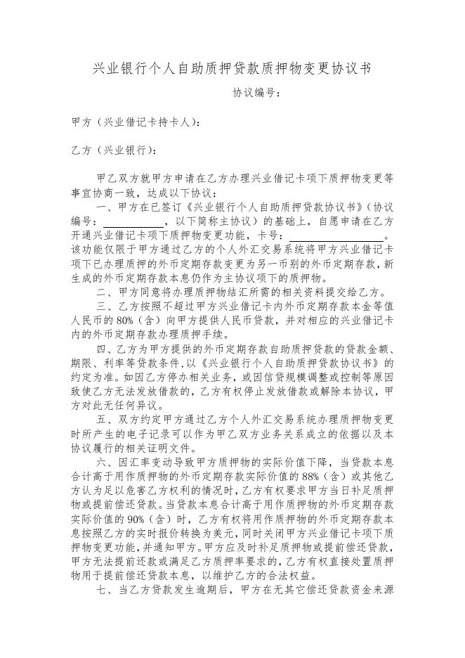 兴业银行个人自助质押贷款质押物变更协议书.pdf