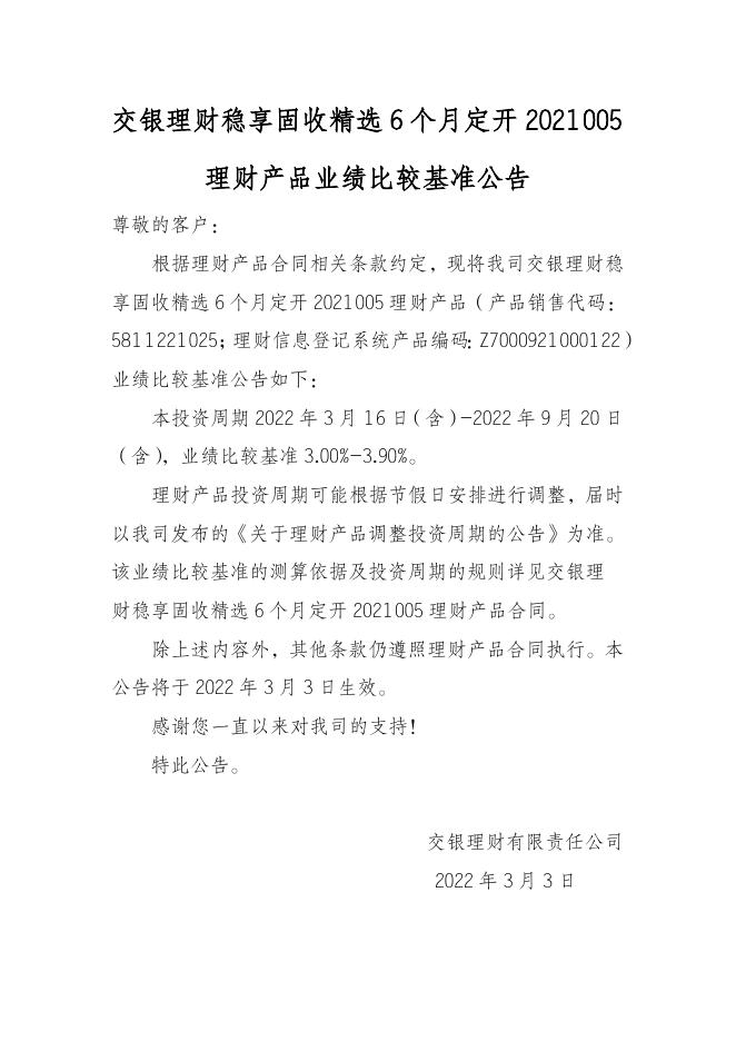 交银理财稳享固收精选6个月定开2021005理财产品业绩比较基准公告.doc