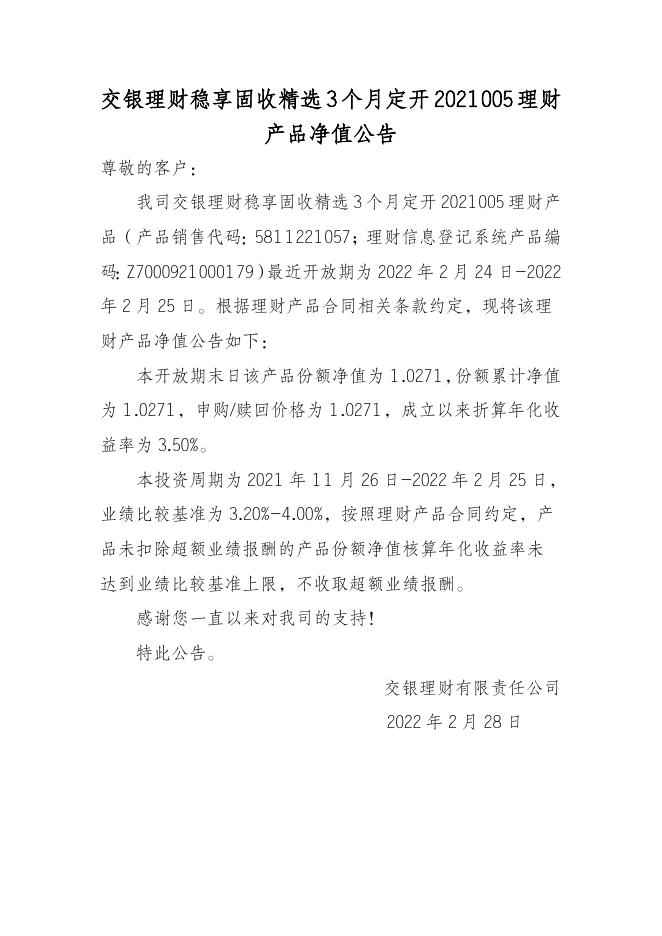 交银理财稳享固收精选3个月定开2021005理财产品净值公告.doc