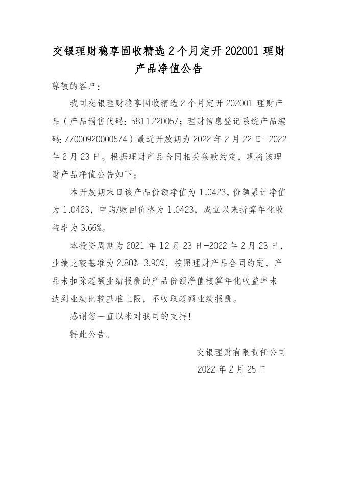交银理财稳享固收精选2个月定开202001理财产品净值公告.doc
