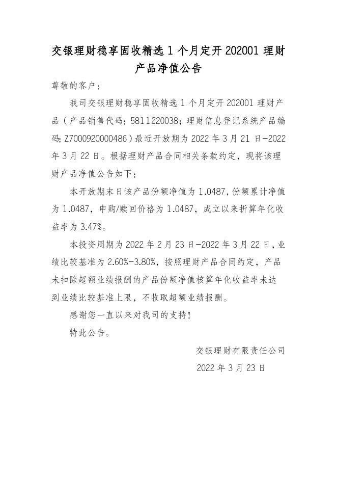 交银理财稳享固收精选1个月定开202001理财产品净值公告.doc