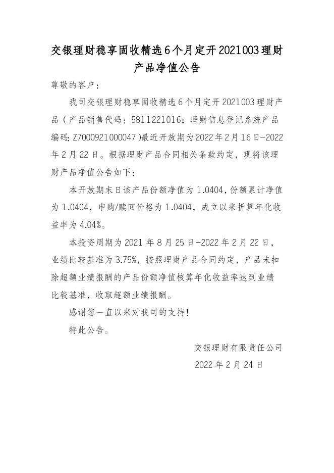 交银理财稳享固收精选6个月定开2021003理财产品净值公告.doc
