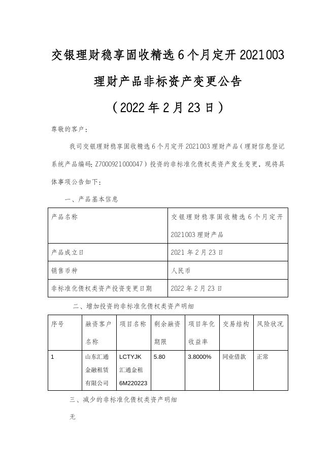 交银理财稳享固收精选6个月定开2021003理财产品非标资产变更公告.doc