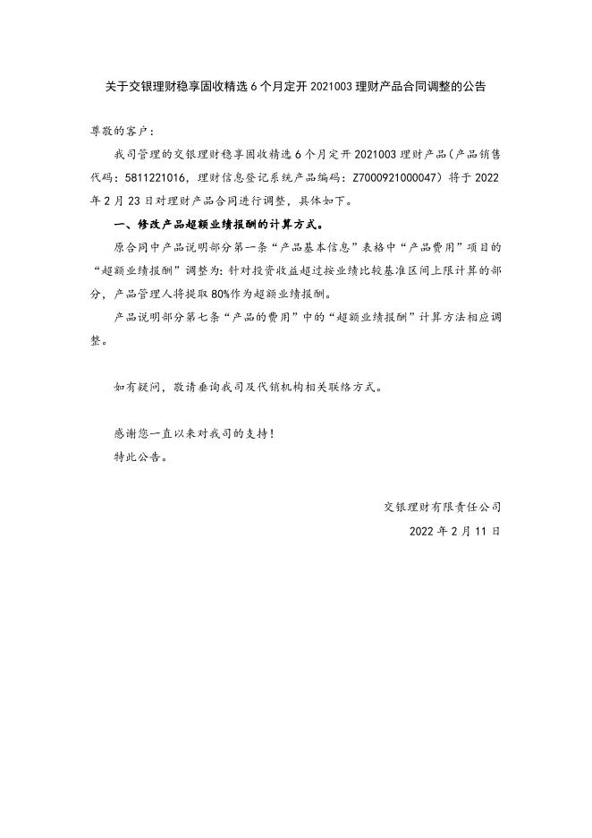 关于交银理财稳享固收精选6个月定开2021003理财产品合同调整的公告.docx
