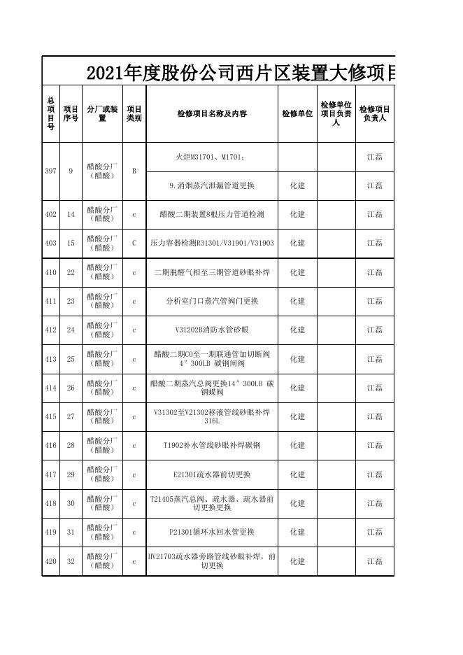 2021年股份公司大修项目表10.12(醋酸标段安装招标).xls