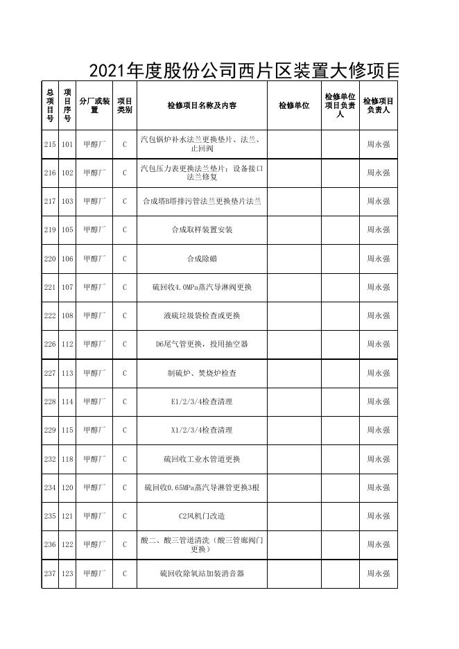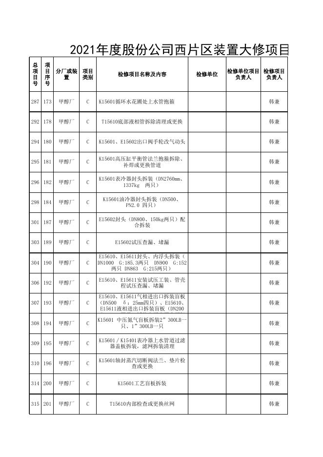 2021年股份公司大修项目表10.12(甲醇合成标段安装招标).xls