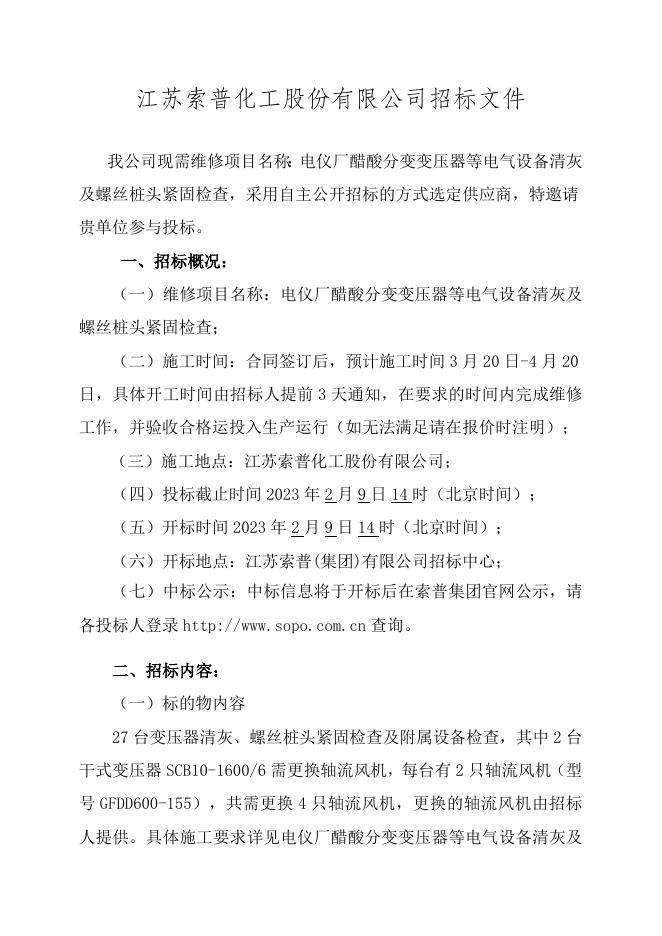 电仪厂醋酸分变变压器等电气设备清灰及螺丝桩头紧固检查自主公开招标招标文件-股份2023.2.9.doc