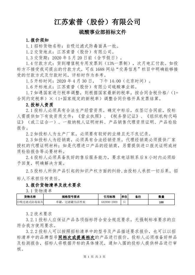 硫酸事业部自吸过滤式防毒面具招标文件2020.4.21.doc