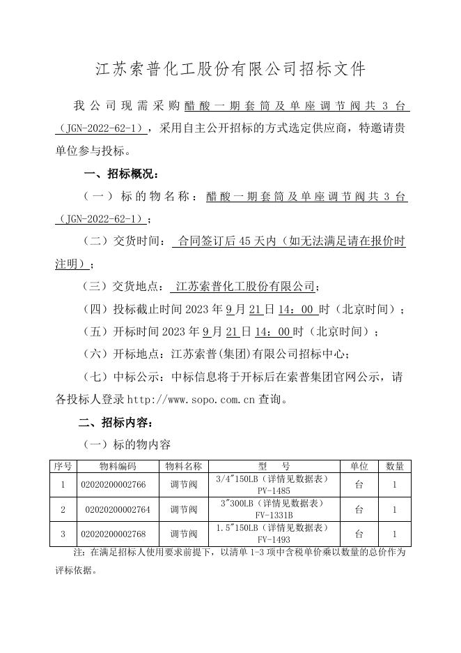 醋酸一期套筒及单座调节阀共3台(JGN-2022-62-1)招标文件-2023.9.14.doc