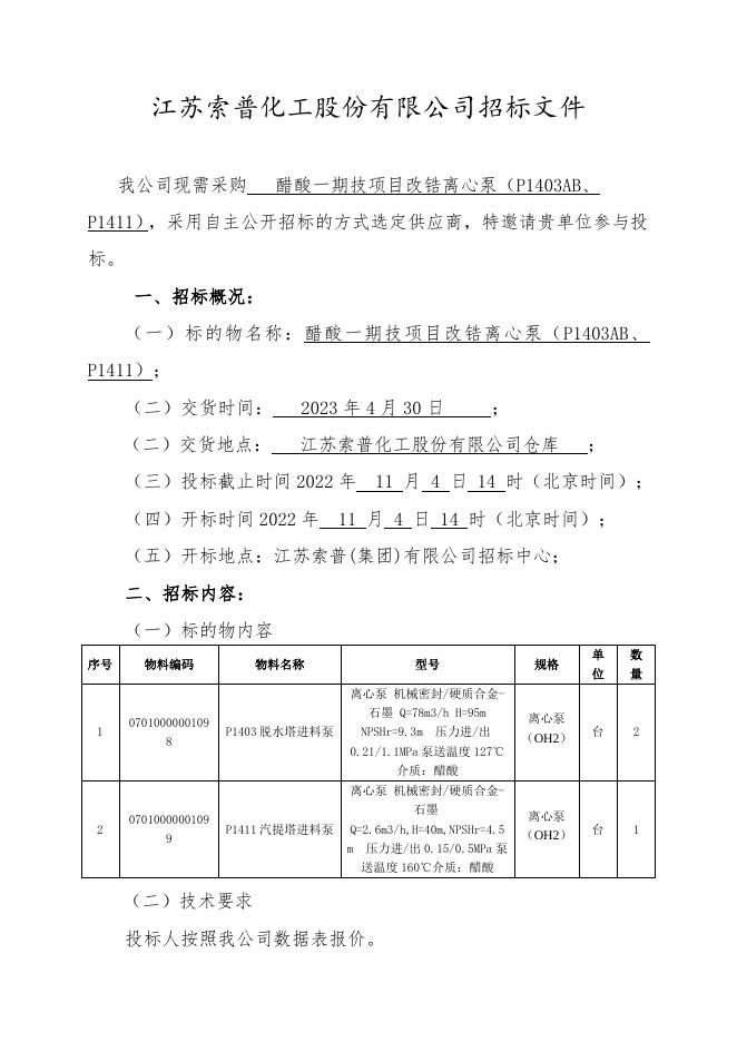 招标文件-醋酸一期技项目改锆离心泵(P1403AB、P1411).doc