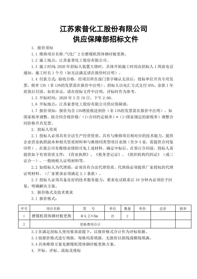 气化厂磨煤机筒体钢衬板更换招标文件2020.3.19 .doc