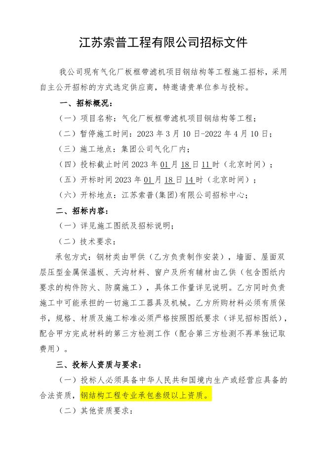 气化厂板框带滤机项目钢结构等工程自主公开招标文件(索普工程计划运行处).doc