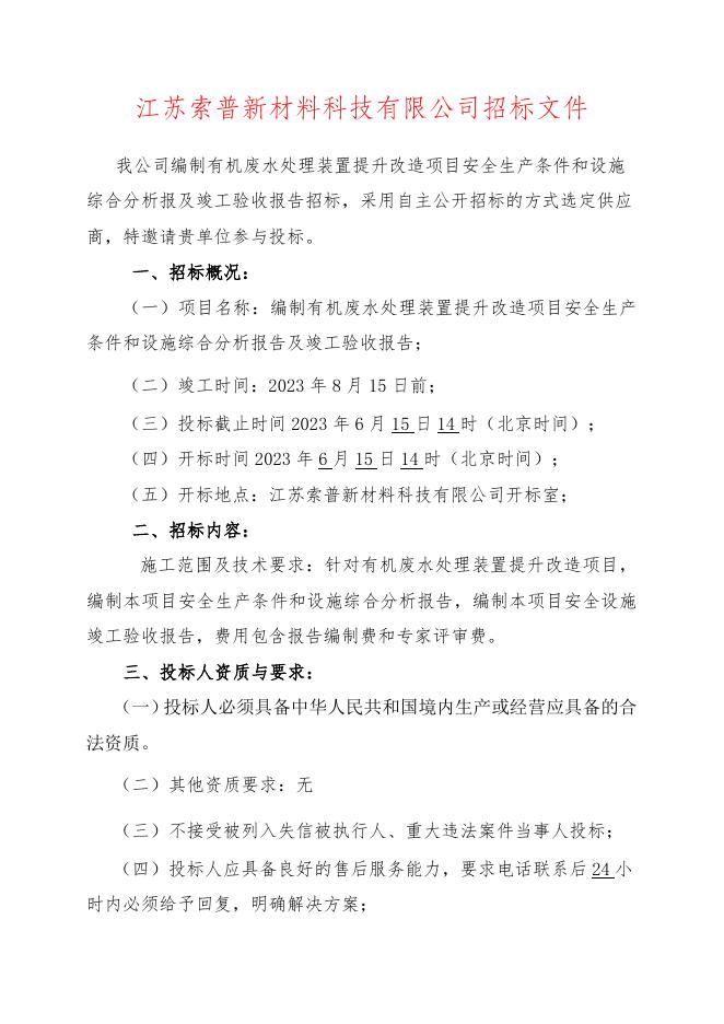 索普新材料编制有机废水处理装置提升改造项目安全生产条件和设施综合分析报告及竣工验收报告招标文件.doc