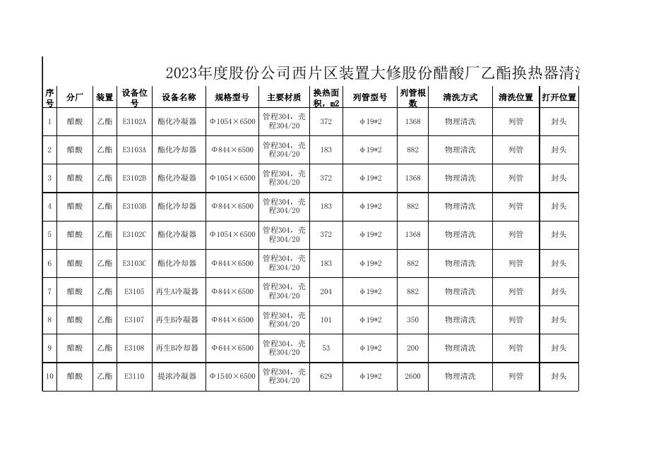 附件一:2023年度股份公司西片区装置大修股份醋酸厂乙酯换热器清洗报价清单.xls
