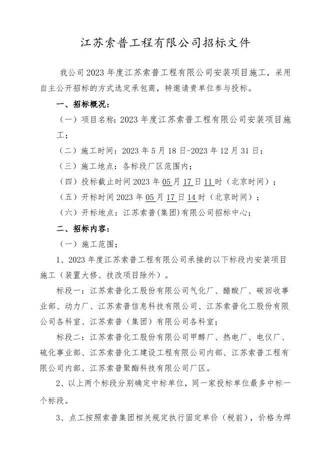 2023年度江苏索普工程有限公司安装项目施工自主公开招标文件(索普工程计划运行处).doc
