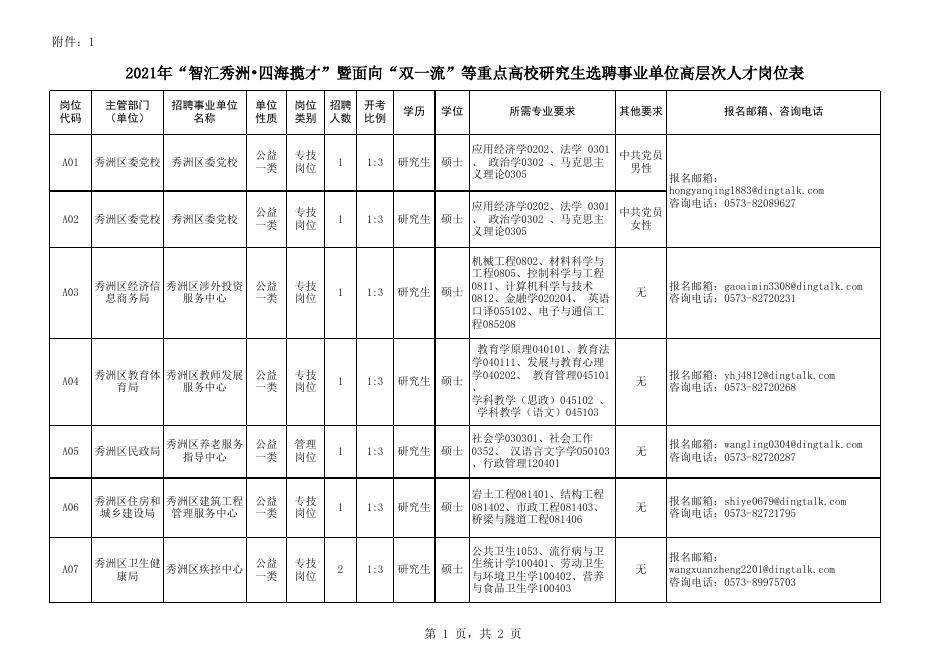 1、2021年“智汇秀洲•四海揽才”暨面向“双一流”等重点高校研究生选聘事业单位高层次人才岗位表.xlsx