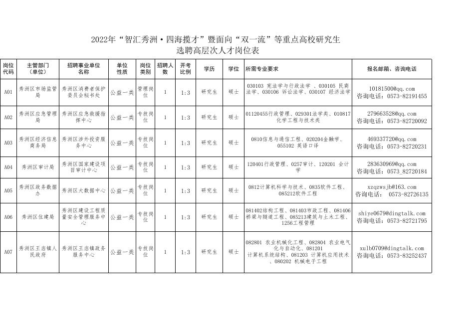 1、2022年“智汇秀洲•四海揽才”暨面向“双一流”等重点高校研究生选聘事业单位高层次人才岗位表.xlsx