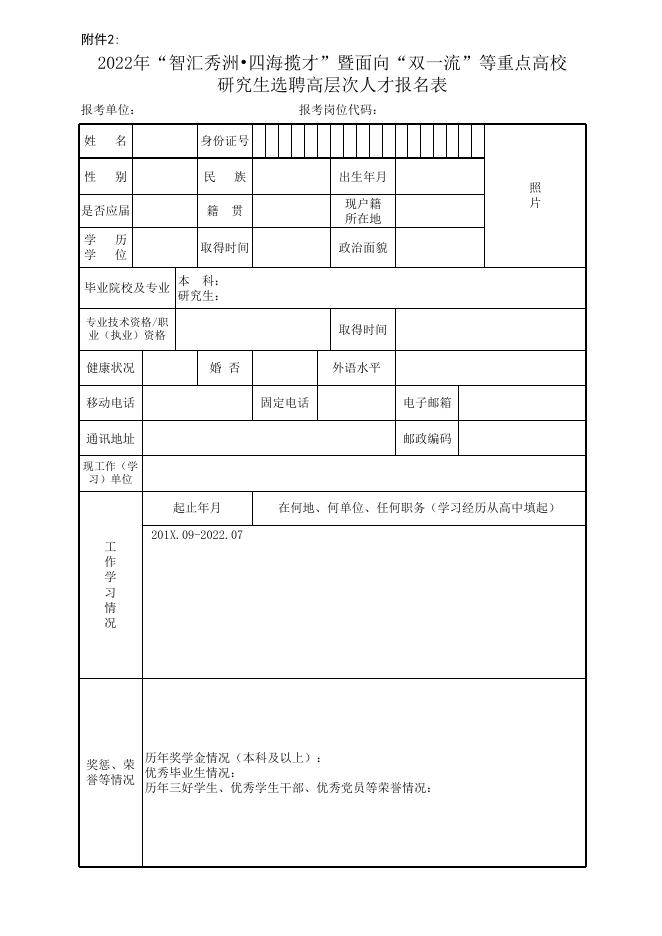 2、2022年“智汇秀洲•四海揽才”暨面向“双一流”等重点高校研究生选聘事业单位高层次人才报名表.xlsx