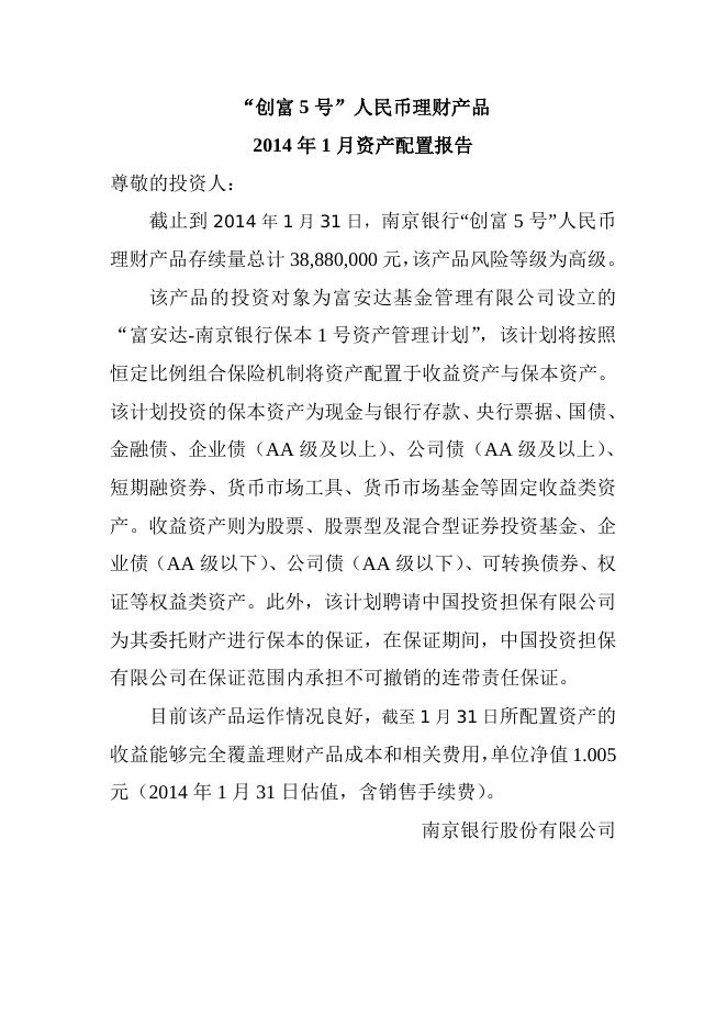 “创富5号”人民币理财产品2014年1月资产配置报告.doc