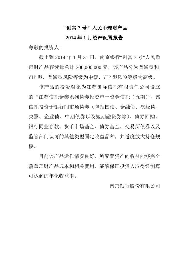 “创富7号”人民币理财产品2014年1月资产配置报告.doc