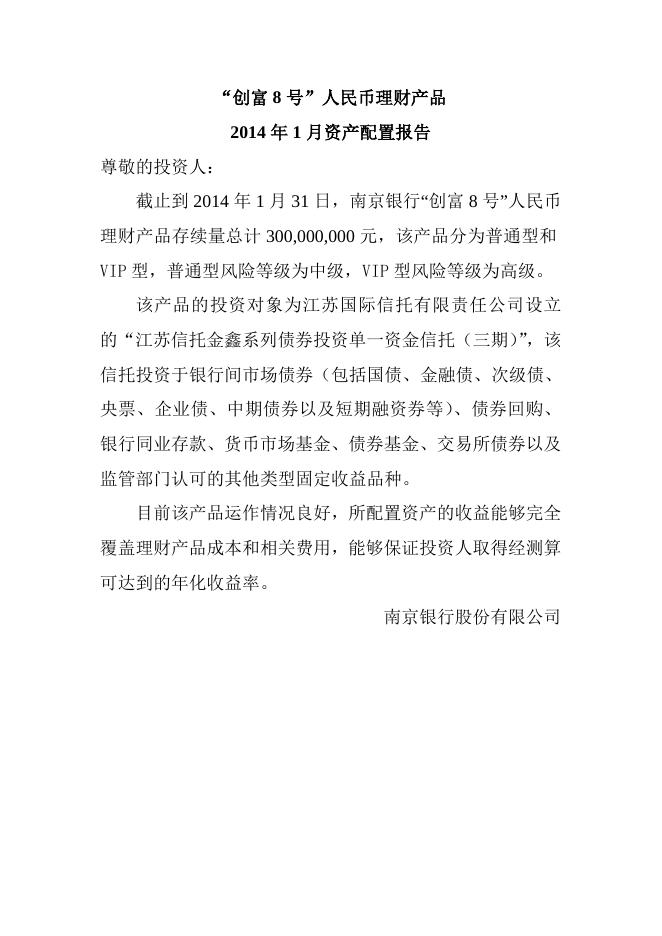 “创富8号”人民币理财产品2014年1月资产配置报告.doc