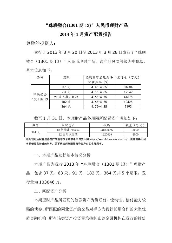 “珠联璧合(1301期13)”人民币理财产品2014年1月资产配置报告.doc