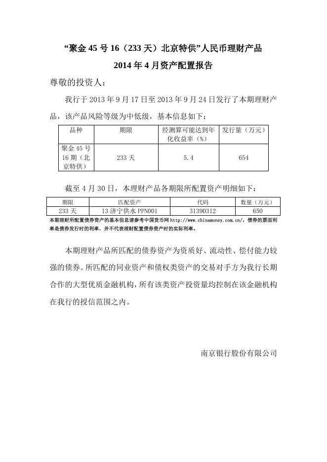 “聚金45号16(233天)北京特供”人民币理财产品2014年4月资产配置报告.doc