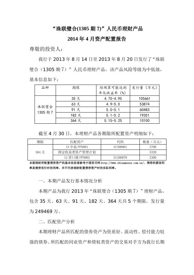 “珠联璧合(1305期7)”人民币理财产品2014年4月资产配置报告.doc