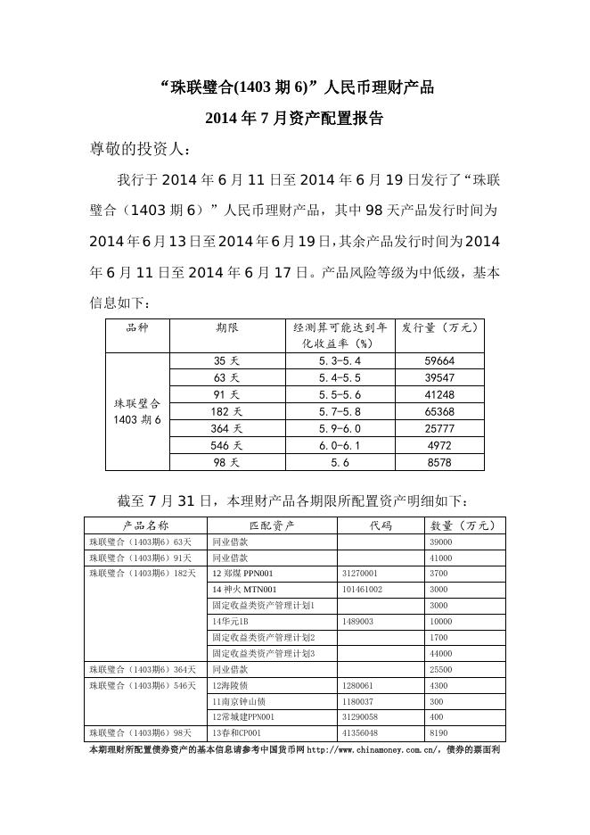“珠联璧合(1403期6)”人民币理财产品2014年7月资产配置报告.doc