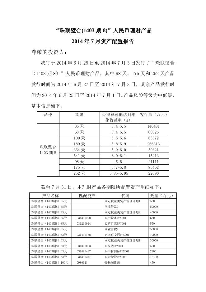 “珠联璧合(1403期8)”人民币理财产品2014年7月资产配置报告.doc