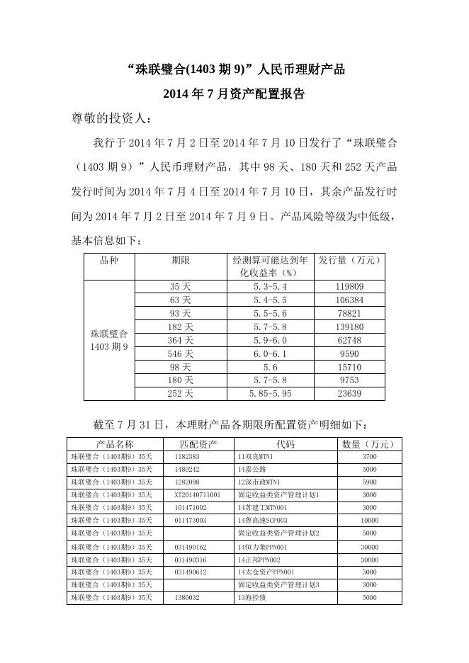 “珠联璧合(1403期9)”人民币理财产品2014年7月资产配置报告.doc