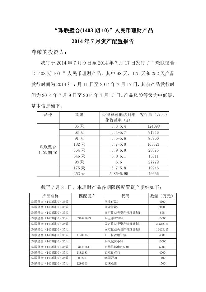 “珠联璧合(1403期10)”人民币理财产品2014年7月资产配置报告.doc