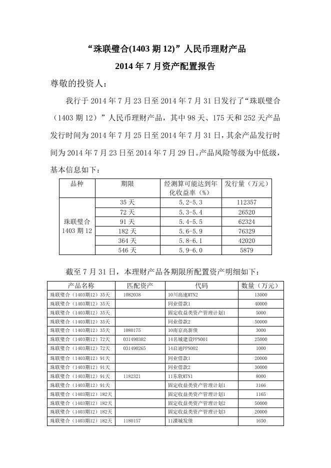 “珠联璧合(1403期12)”人民币理财产品2014年7月资产配置报告.doc
