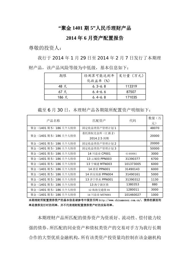 “聚金1401期6”人民币理财产品2014年6月资产配置报告.doc