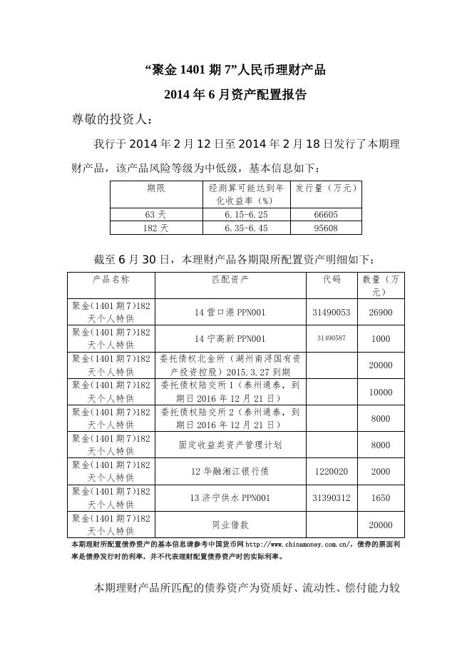 “聚金1401期7”人民币理财产品2014年6月资产配置报告.doc