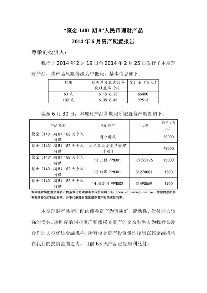 “聚金1401期8”人民币理财产品2014年6月资产配置报告.doc