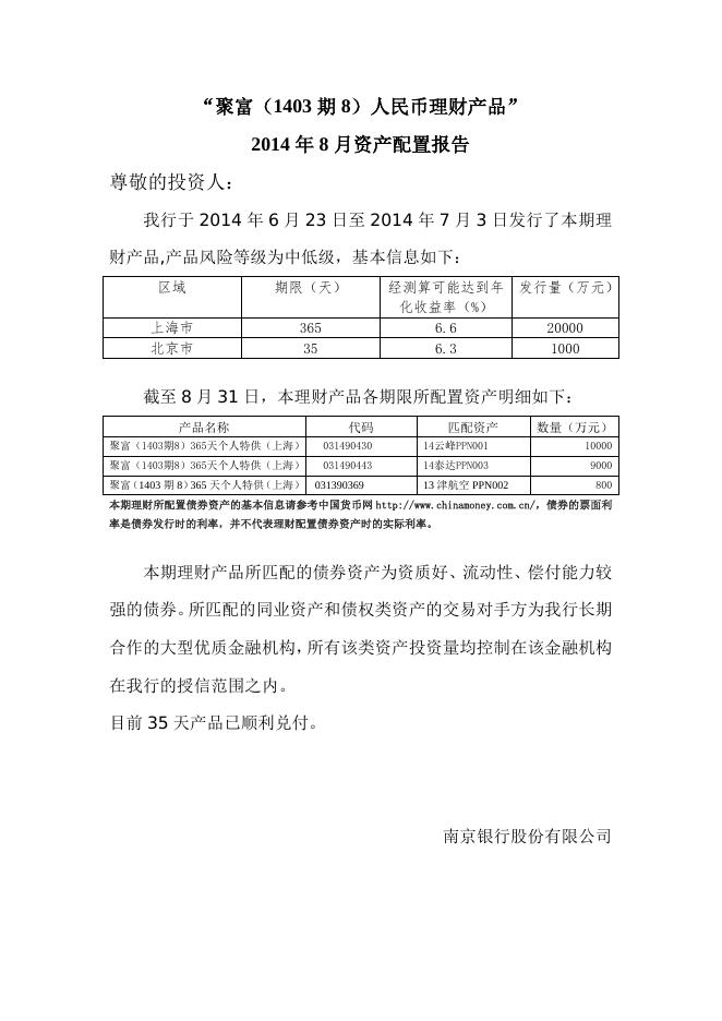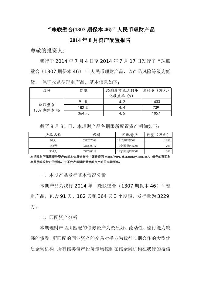 “珠联璧合(1307期保本46)”人民币理财产品2014年8月资产配置报告.doc