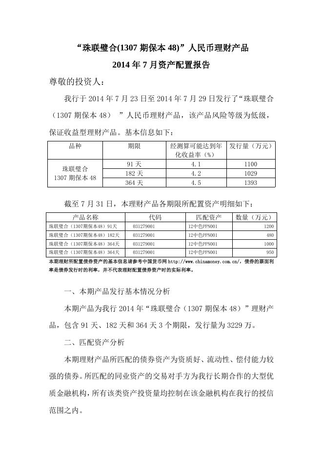 “珠联璧合(1307期保本48)”人民币理财产品2014年7月资产配置报告.doc